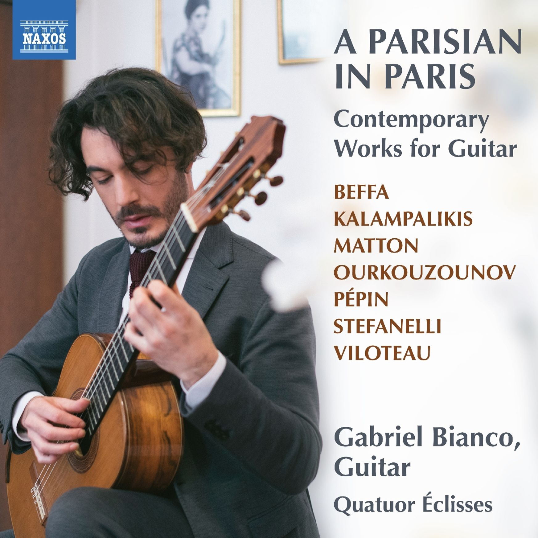 This album presents a diverse selection of world premieres commissioned by the award-winning guitarist, Gabriel Bianco, from composers who have lived and worked in his native Paris. These range from the swirling Spanish motifs in Matthieu Stefanelli’s Ellipsis for four guitars, featuring the Quatuor Éclisses, to Camille Pépin’s hypnotic Autumn Rhythm and Thomas Viloteau’s festive A Night in Bastille – just a few of the highlights in this programme of new guitar music from the City of Light.
