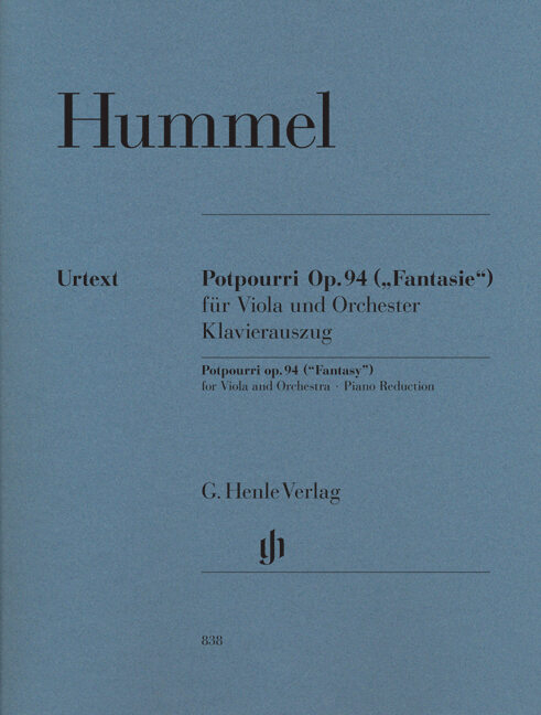 Hummels ''Potpourri'' for Viola and Orchestra op. 94 is part of every viola player's core reşpertoire, especially in its shortened version, the ''Fantasy''. Sprinkled with quotes from operas by Mozart and Rossini and framed by spirited, newly composed passages, the ''Potpourri'' fills a gap in the small repertoire of the classical-early romantic period. Tabea Zimmermann has drawn upon her extensive experience in providing fingerings and bowings for the solo part. And it goes without saying that the ''Fantasy'' version can also be played using our edition.